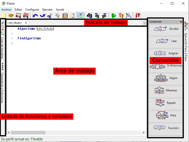 El entorno principal de PSeInt está dividido en varias secciones, cada una diseñada para facilitar el proceso de programación: