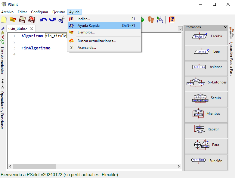 Al iniciar PSeInt, se mostrará la ventana "Bienvenido a PSeInt", en la cual se debe elegir una de las siguientes opciones:
